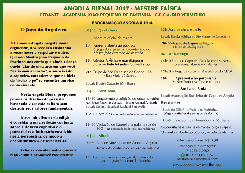 O CEDANZE – Brasil · França · Mestre Faísca Academia João Pequeno de Pastinha – CECA Rio Vermelho | Vale das Pedrinhas, convida Mestres, professores, alunos e simpatizantes para “o jogo do angoleiro” na Angola Bienal 2017. Divulguém o evento com seus amigos, todos serão bem vindos!