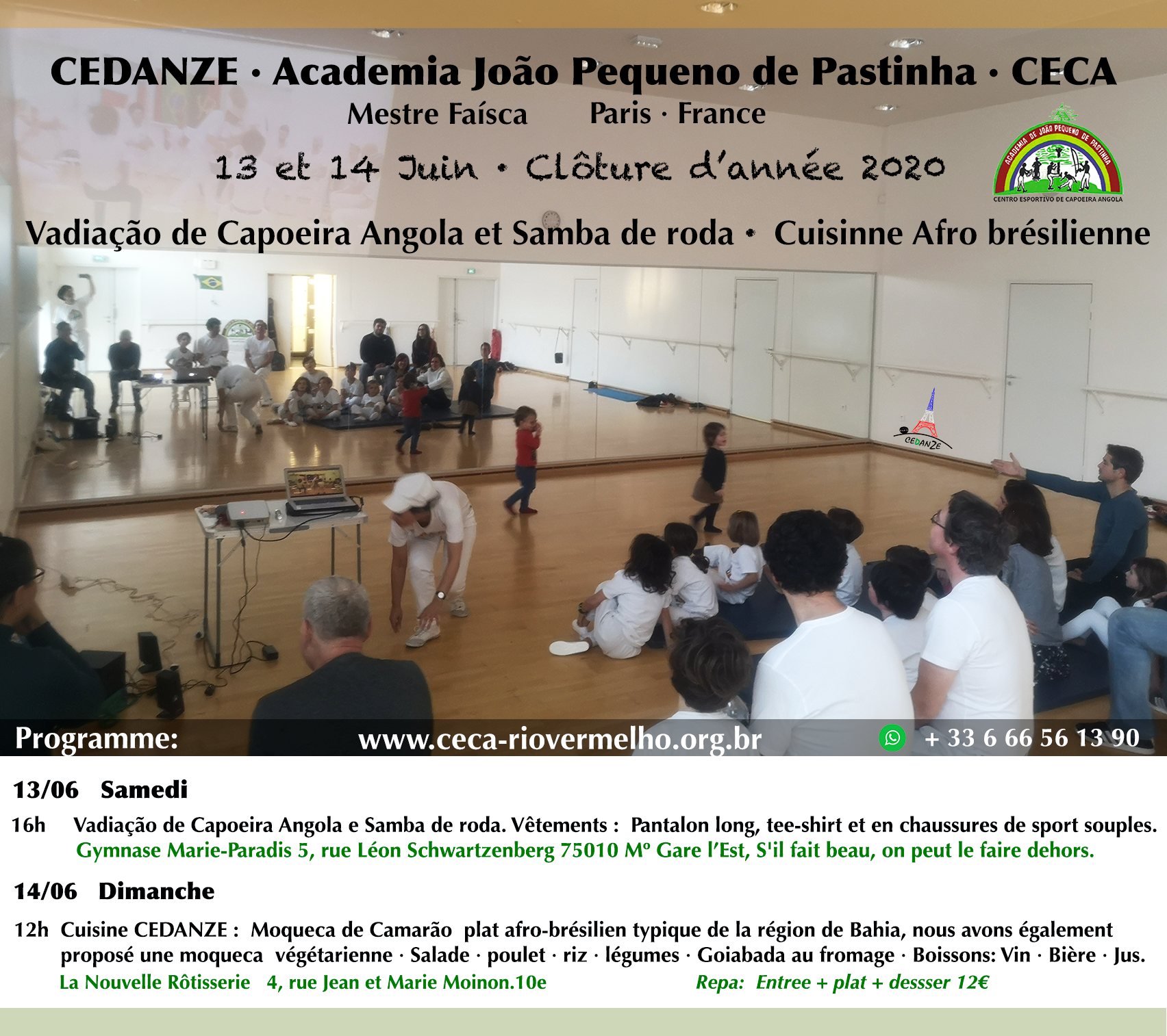 No encerramento de ano da sessão 2020 do CEDANZE AJPP-CECA na cidade Paris França, teremos uma programação especial com a participação de Mestres, professores vindo do Brasil, de residentes na França, dos EUA, e de outros países Europeus . O evento acontecerá nos dias 13 e 14 de junho, com muita Vadiação de Capoeira Angola, Samba de Roda e a realização de uma cozinha afro brasileira com musica ao vivo.